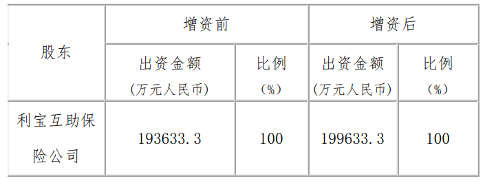本次增資金額為六千萬元人民幣(60,000,000 元人民 幣),由利寶互助保險公司出資,無新增股東。